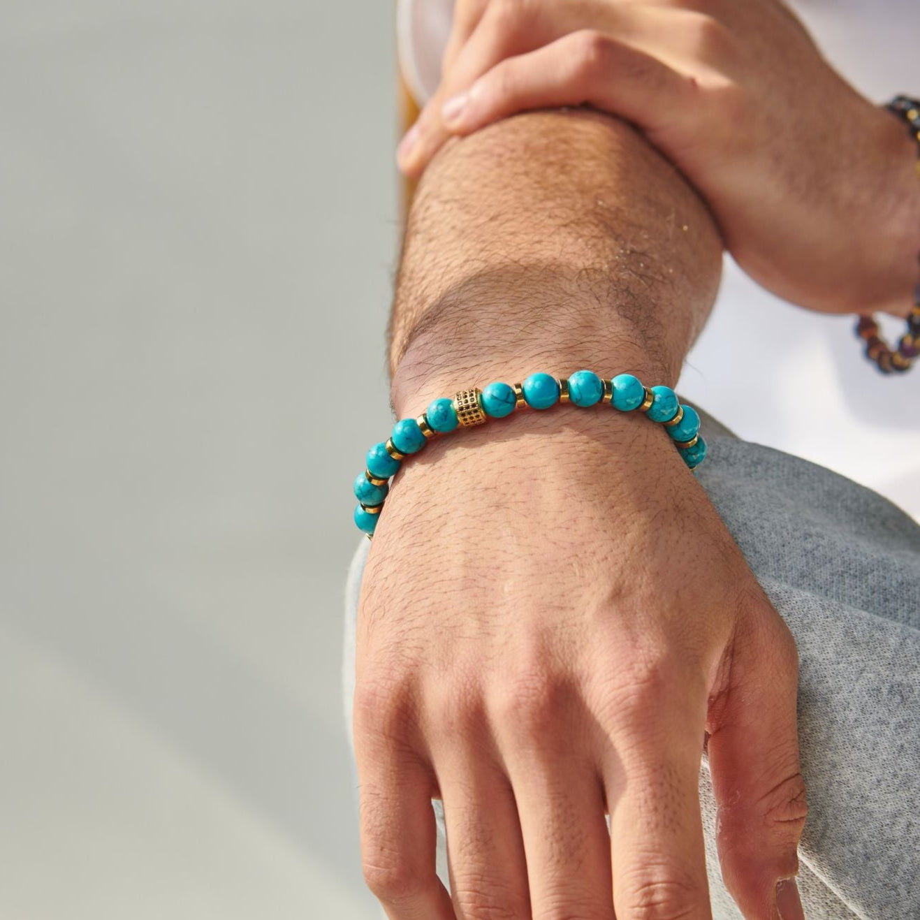 Turquoise is believed to bring physical, psychological, and spiritual benefits, including improved respiratory health, strengthened immunity, calming the nerves, reducing stress, and increasing self-confidence, as well as protection from negative energy and improving the ability to communicate clearly.