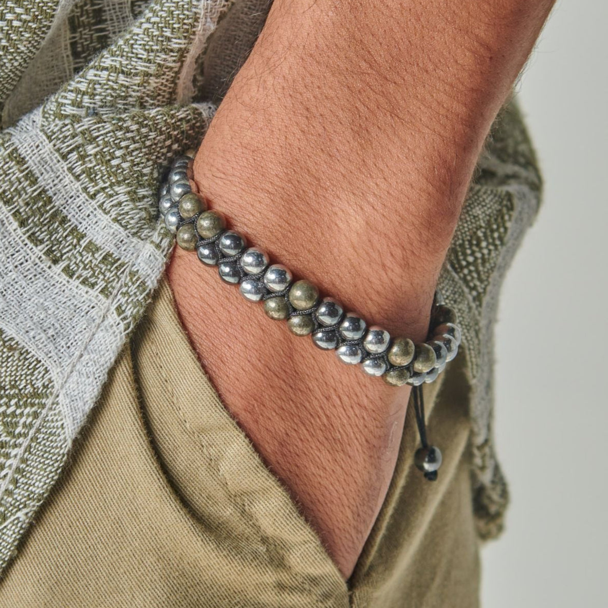 From the Arab heritage, we were inspired to design this bracelet, which is a combination of Pyrite stone beads with sparkling hematite stone beads in a beautiful arrangement.