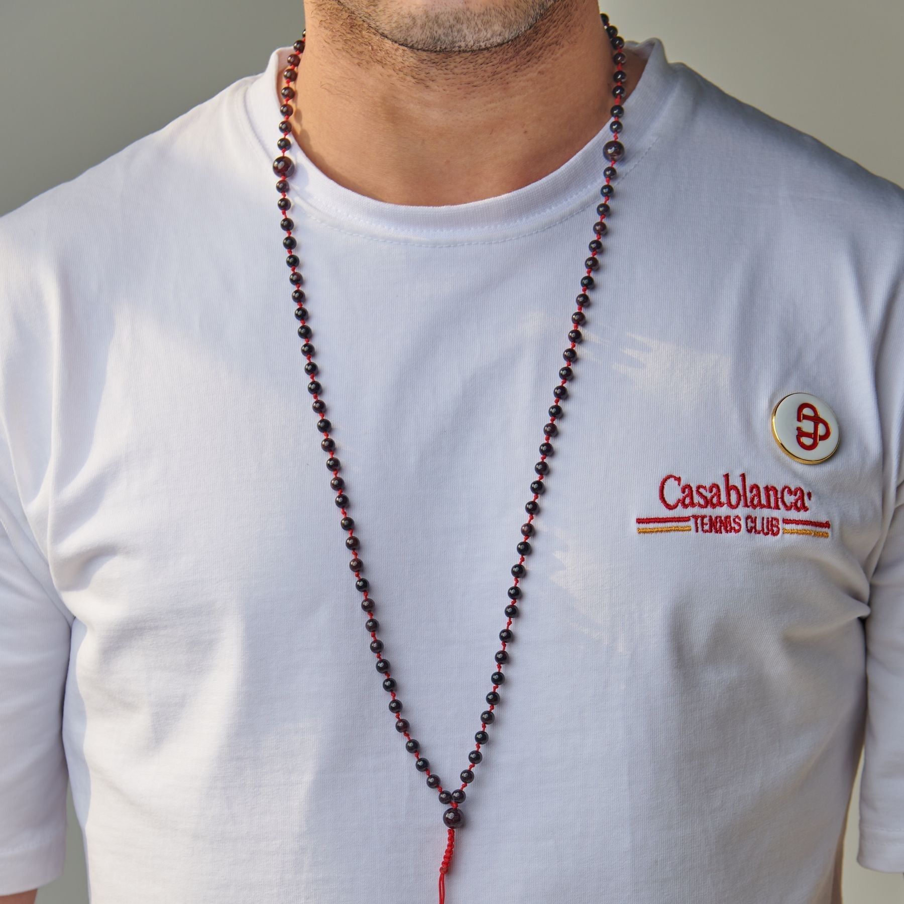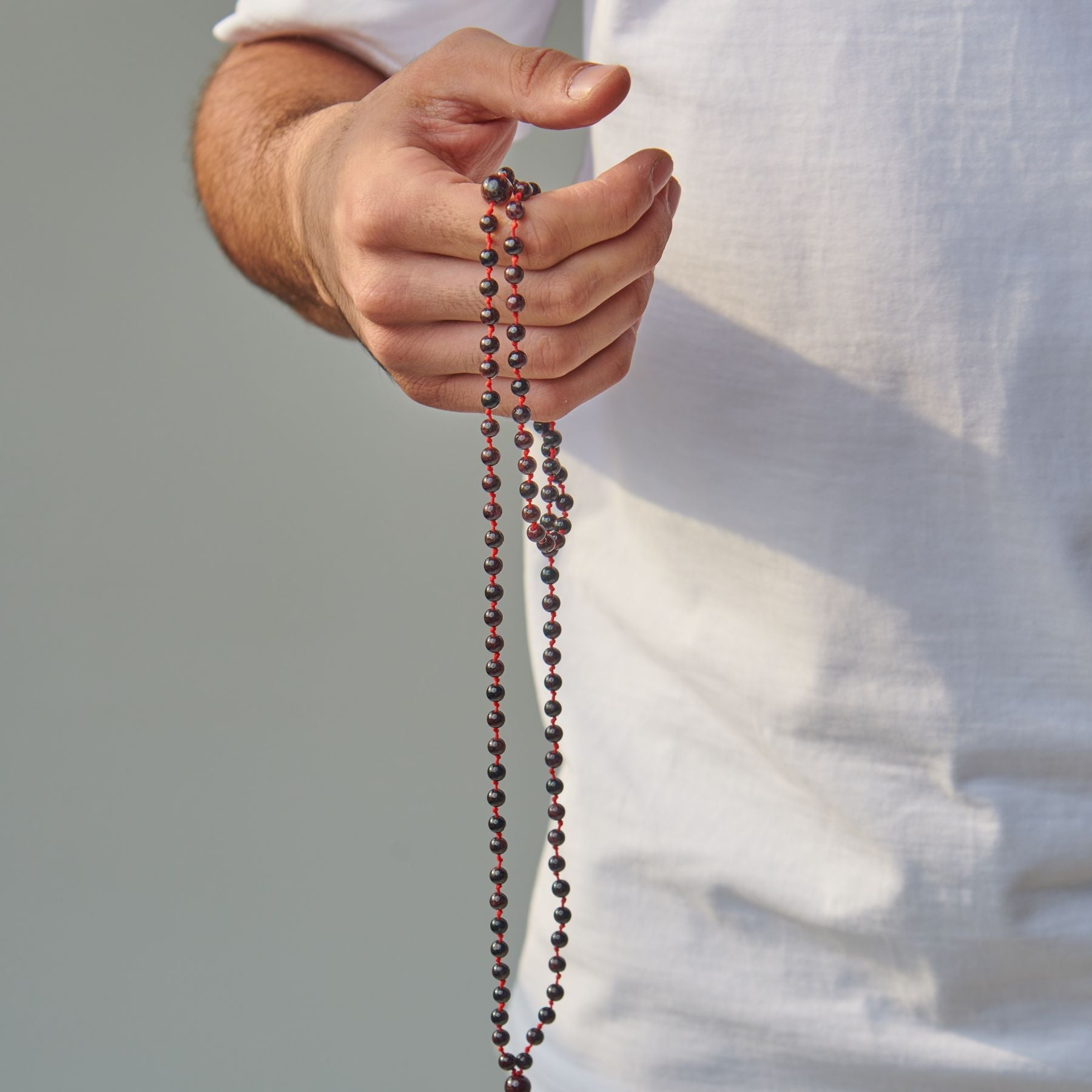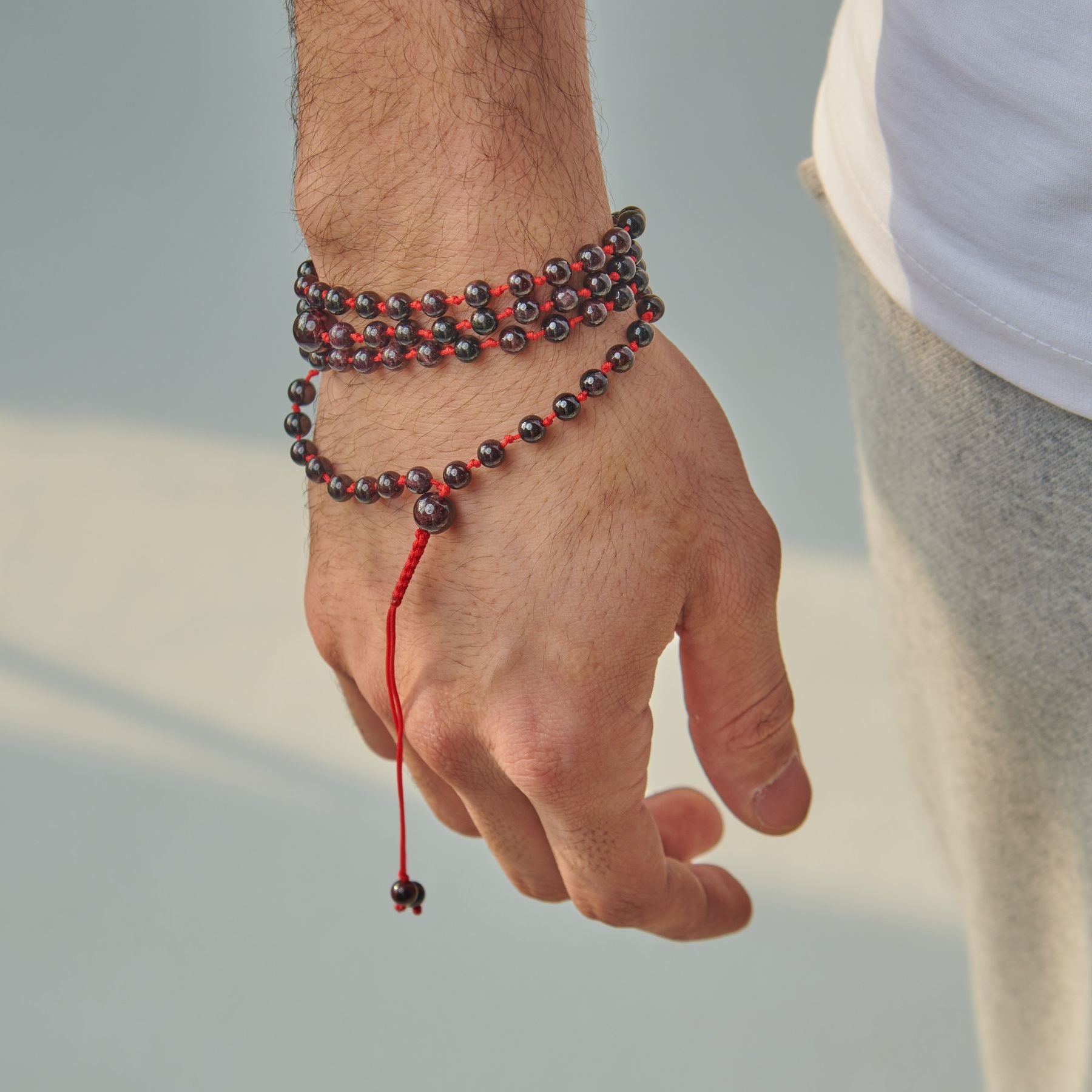 We offer you this wonderful rosary bracelet that you can wear all the time, accompany you in your day, inspire you and remind you of what is important, and add a beautiful touch to your daily look.This piece of art is carved from natural garnet stone, carefully arranged, and assembled with a very strong thread that we guarantee for life.Our artists designed this rosary bracelet to be easily worn, just pull the small hand-braided lighthouse to untie (loose) the rosary, then wrap it three times around your wrist, and tighten it to become wrapped comfortably and appropriately.