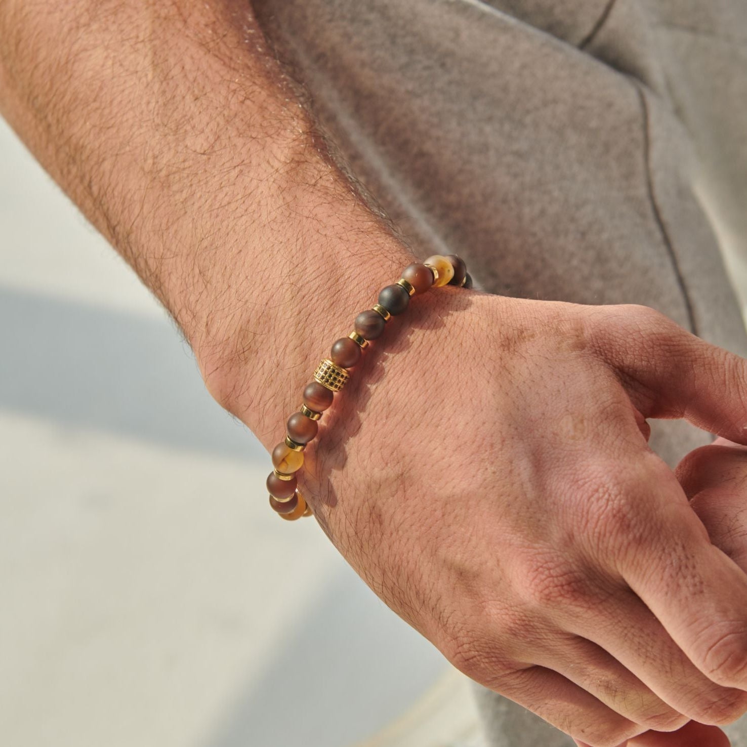 This Bracelet is distinguished by its elegant circular shape, which gives it a charming effect. We carved it for you with pure love, designed from a matte Yemeni agate stone, inlaid with zircon stones and precious hematite stones, so that it comes to you as a precious gift.Artists have assembled these bracelets with extra strong thread that we guarantee for life.Surprise your loved ones with this special bracelet made with love.