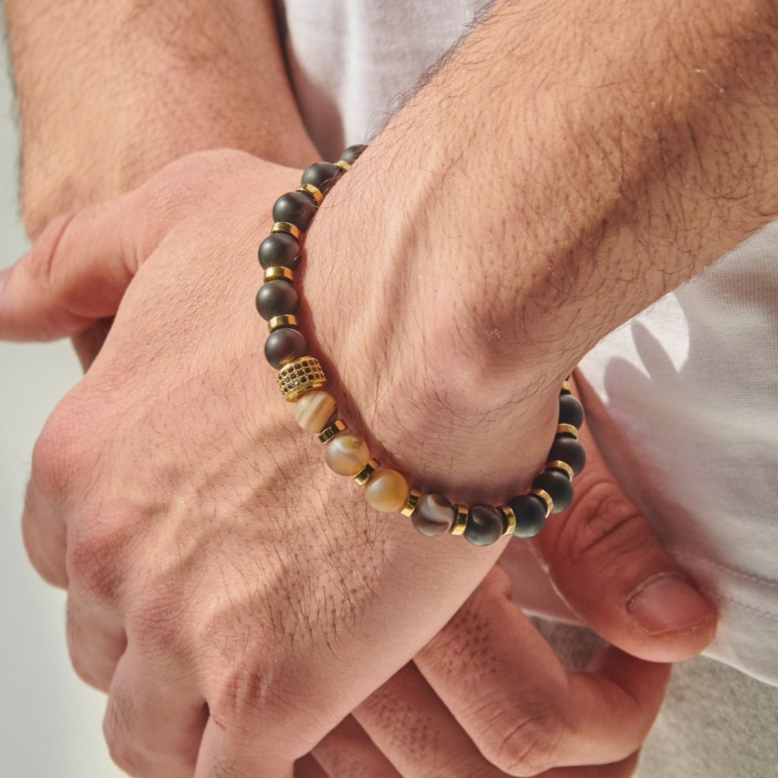 This Bracelet is distinguished by its elegant circular shape, which gives it a charming effect. We carved it for you with pure love, designed from a matte Yemeni agate stone, inlaid with zircon stones and precious hematite stones, so that it comes to you as a precious gift.Artists have assembled these bracelets with extra strong thread that we guarantee for life.Surprise your loved ones with this special bracelet made with love.