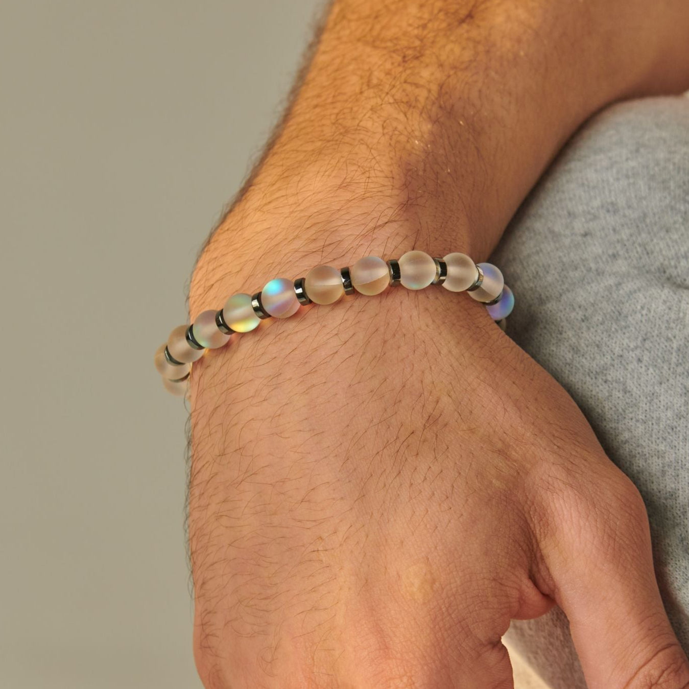 This Bracelet is distinguished by its elegant circular shape, which gives it a charming effect. We carved it for you with pure love, designed from moonstone inlaid and precious hematite stones, so that it comes to you as a precious gift.Artists have assembled these bracelets with extra strong thread that we guarantee for life.Surprise your loved ones with this special bracelet made with love.