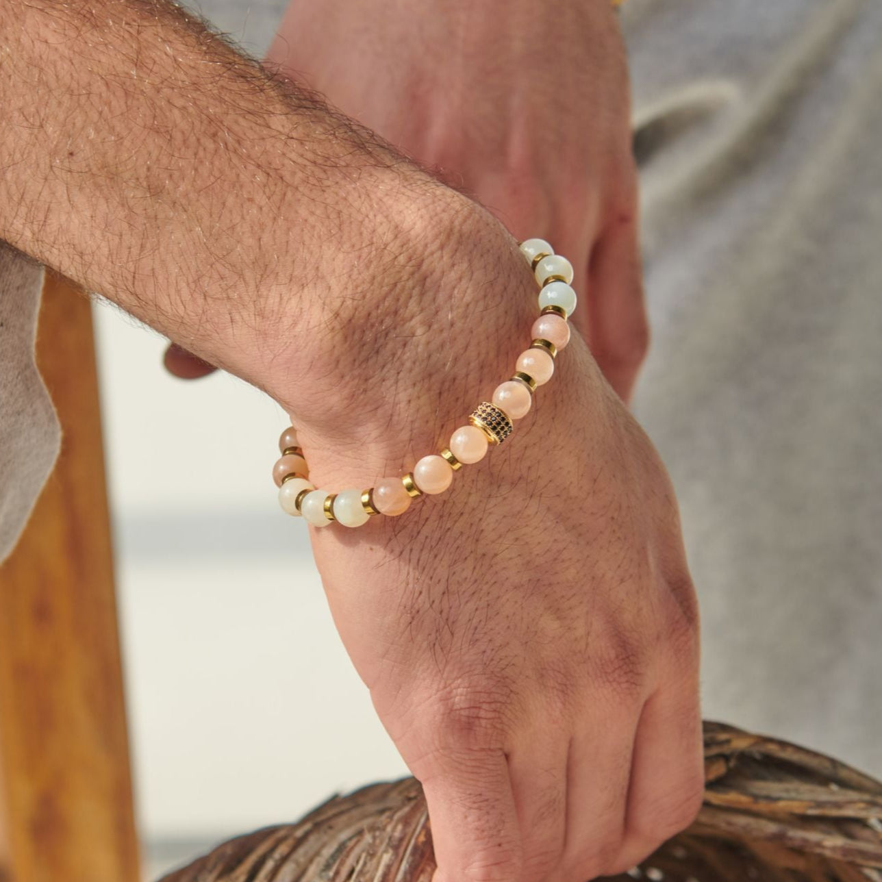 This Bracelet is distinguished by its elegant circular shape, which gives it a charming effect. We carved it for you with pure love, designed from moonstone inlaid with zircon stones and precious hematite stones, so that it comes to you as a precious gift.Artists have assembled these bracelets with extra strong thread that we guarantee for life.Surprise your loved ones with this special bracelet made with love.