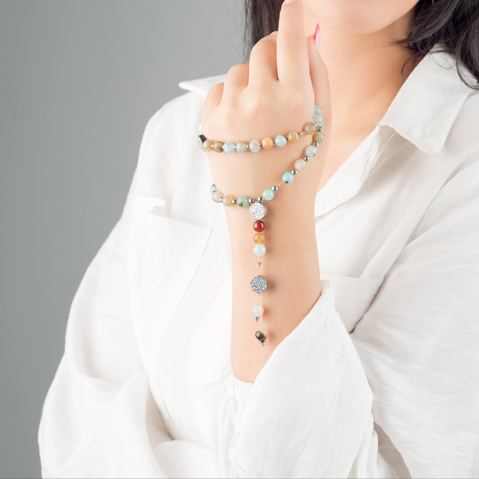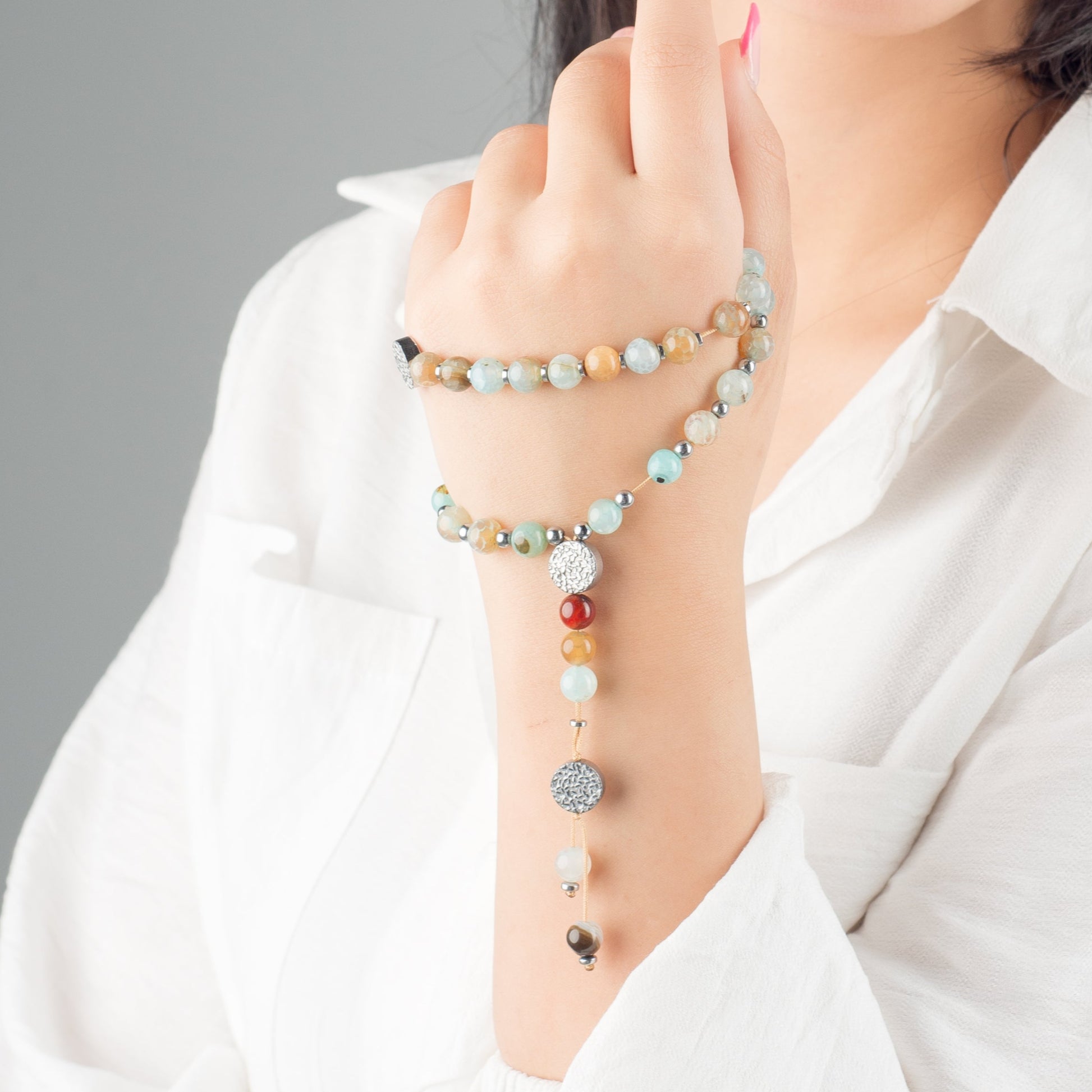 We offer you this wonderful rosary bracelet that you can wear all the time, accompany you in your day, inspire you and remind you of what is important, and add an aesthetic touch to your daily look.This piece of art is carved from natural Agate stone, carefully arranged, and assembled with a very strong thread that we guarantee for life.Our artists designed this rosary bracelet to be easily worn, just pull the small hand-braided lighthouse to untie (loose) the rosary, then wrap it 2 times around your wrist, and tighten it to become wrapped comfortably and conveniently.