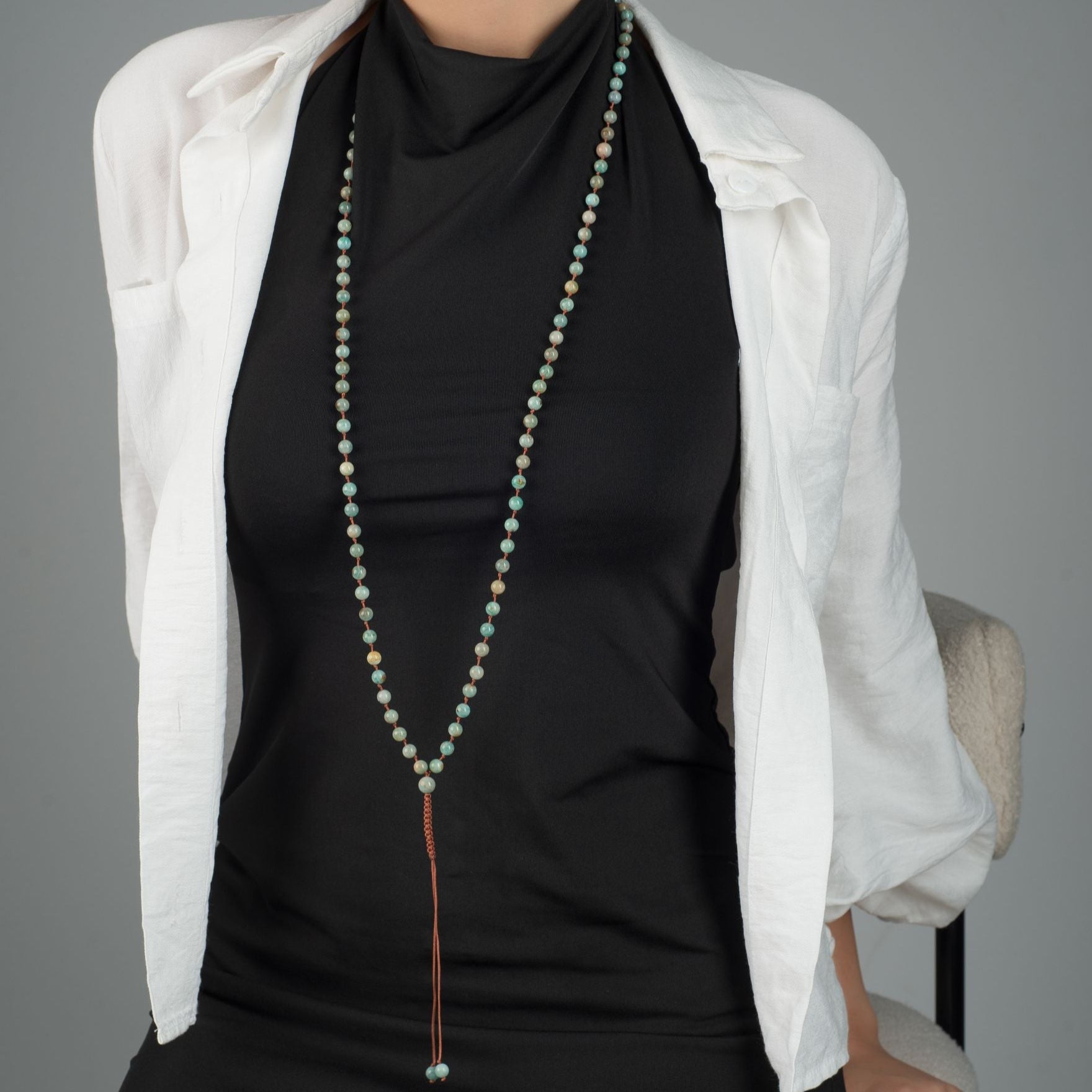 We offer you this wonderful rosary bracelet that you can wear all the time, accompany you in your day, inspire you and remind you of what is important, and add a beautiful touch to your daily look.This piece of art is carved from natural Amazonite stone, carefully arranged, and assembled with a very strong thread that we guarantee for life.Our artists designed this rosary bracelet to be easily worn, just pull the small hand-braided lighthouse to untie (loose) the rosary, then wrap it three times around your wrist, and tighten it to become wrapped comfortably and conveniently.