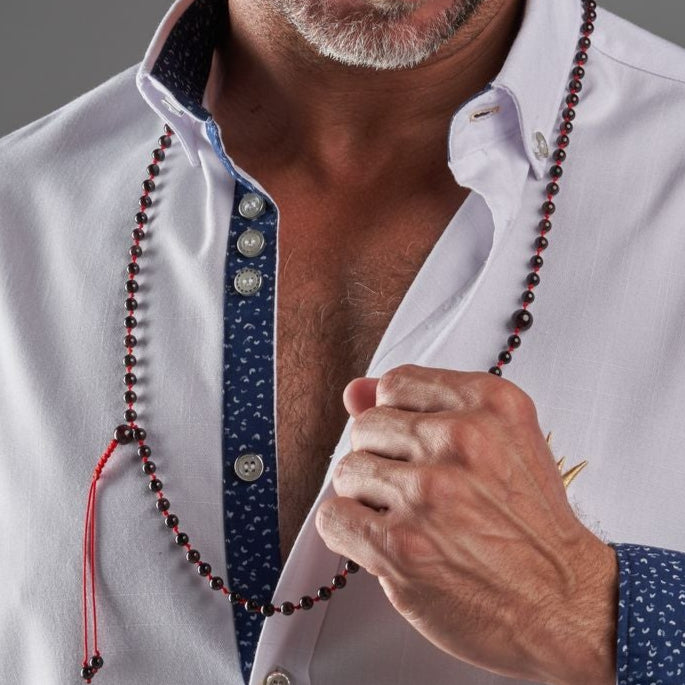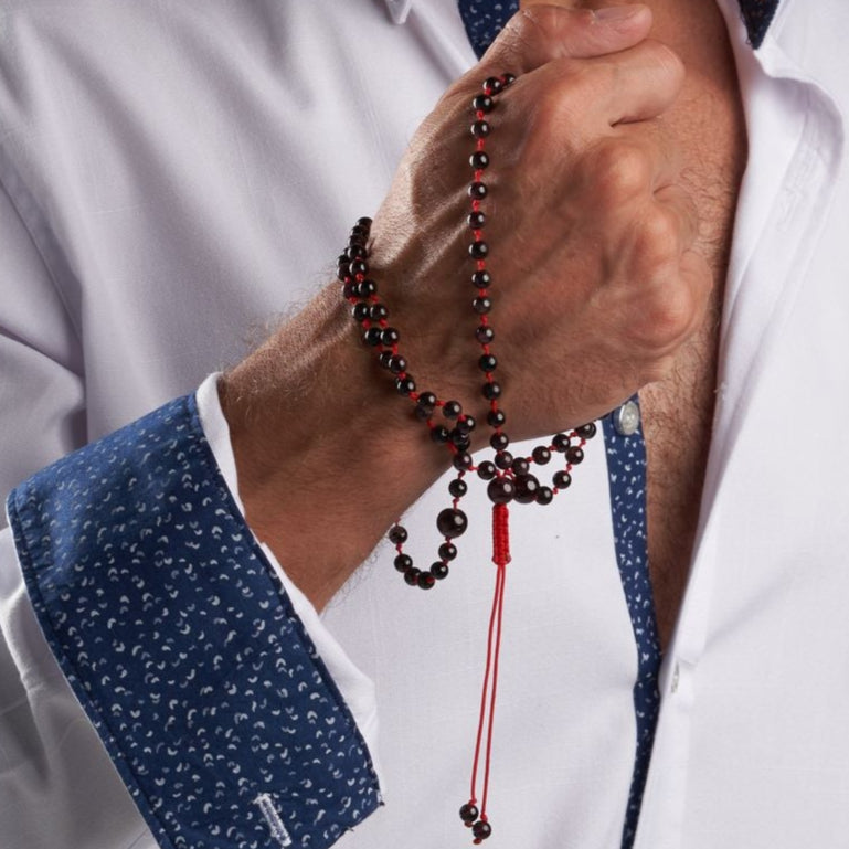 We offer you this wonderful rosary bracelet that you can wear all the time, accompany you in your day, inspire you and remind you of what is important,This piece of art is carved from natural garnet stone, carefully arranged, and assembled with a very strong thread that we guarantee for life.Our artists designed this rosary bracelet to be easily worn, just pull the small hand-braided lighthouse to untie (loose) the rosary, then wrap it three times around your wrist, and tighten it to become wrapped comfortably and conveniently.