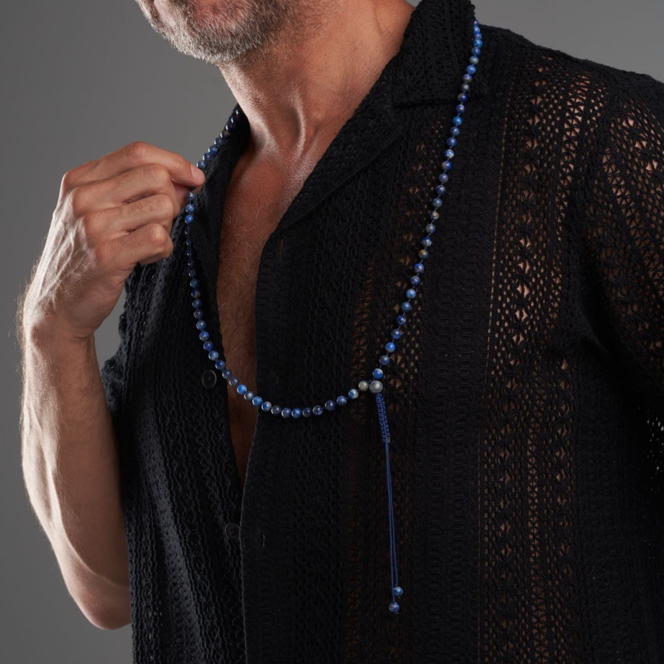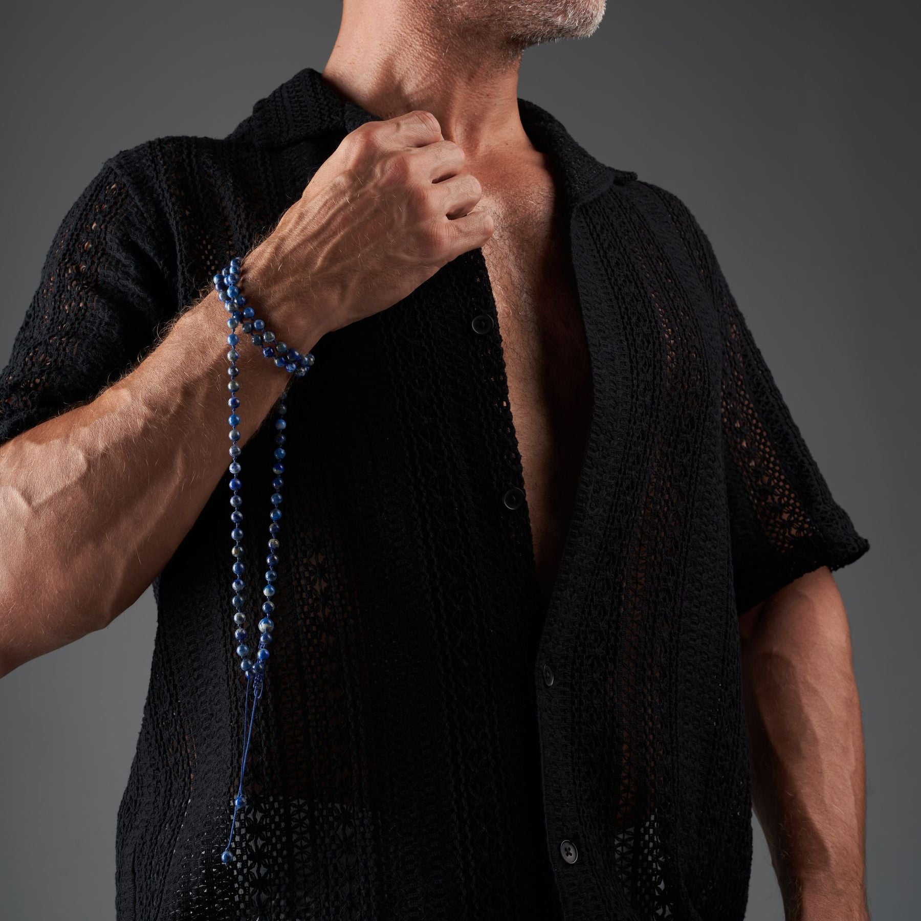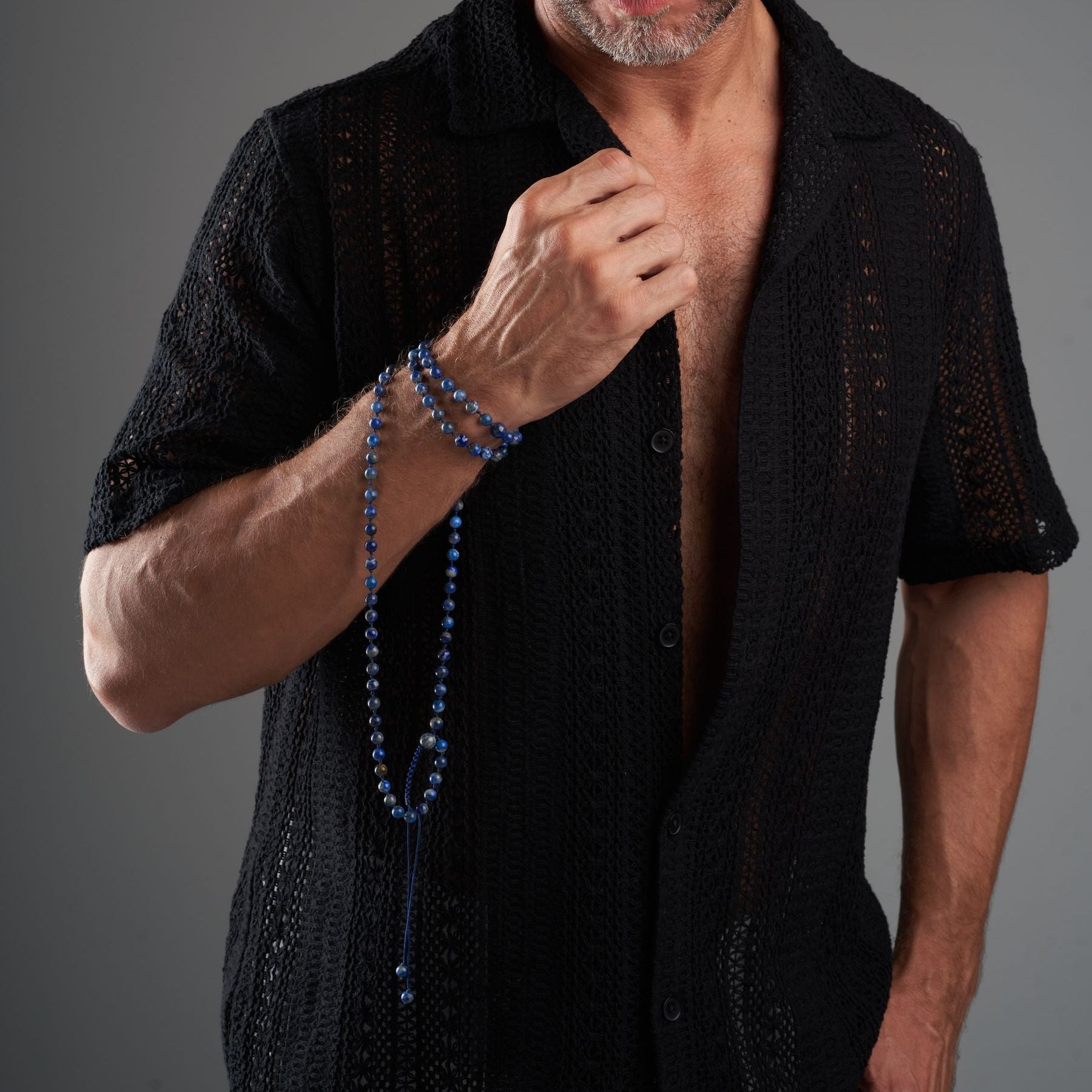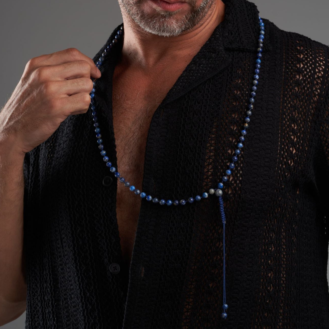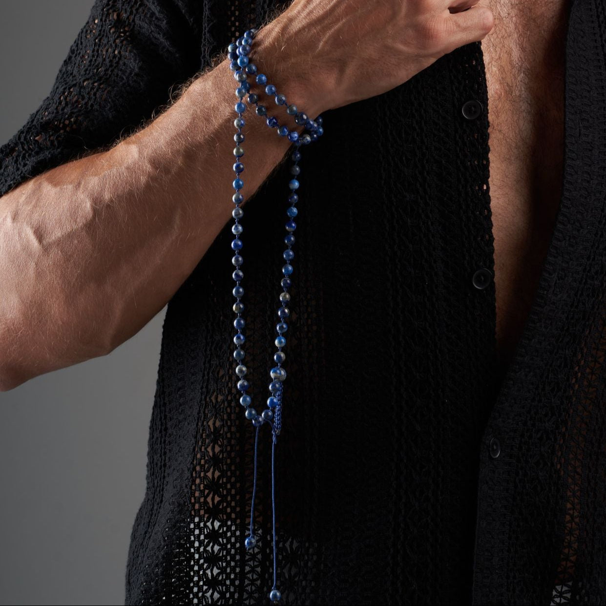 We offer you this wonderful rosary bracelet that you can wear all the time, accompany you in your day, inspire you and remind you of what is important, and add a beautiful touch to your daily look.This piece of art is carved from natural lapis lazuli stone, carefully arranged, and assembled with a very strong thread that we guarantee for life.Our artists designed this rosary bracelet to be easily worn, just pull the small hand-braided lighthouse to untie (loose) the rosary, then wrap it three times around your wrist, and tighten it to become wrapped comfortably and conveniently.