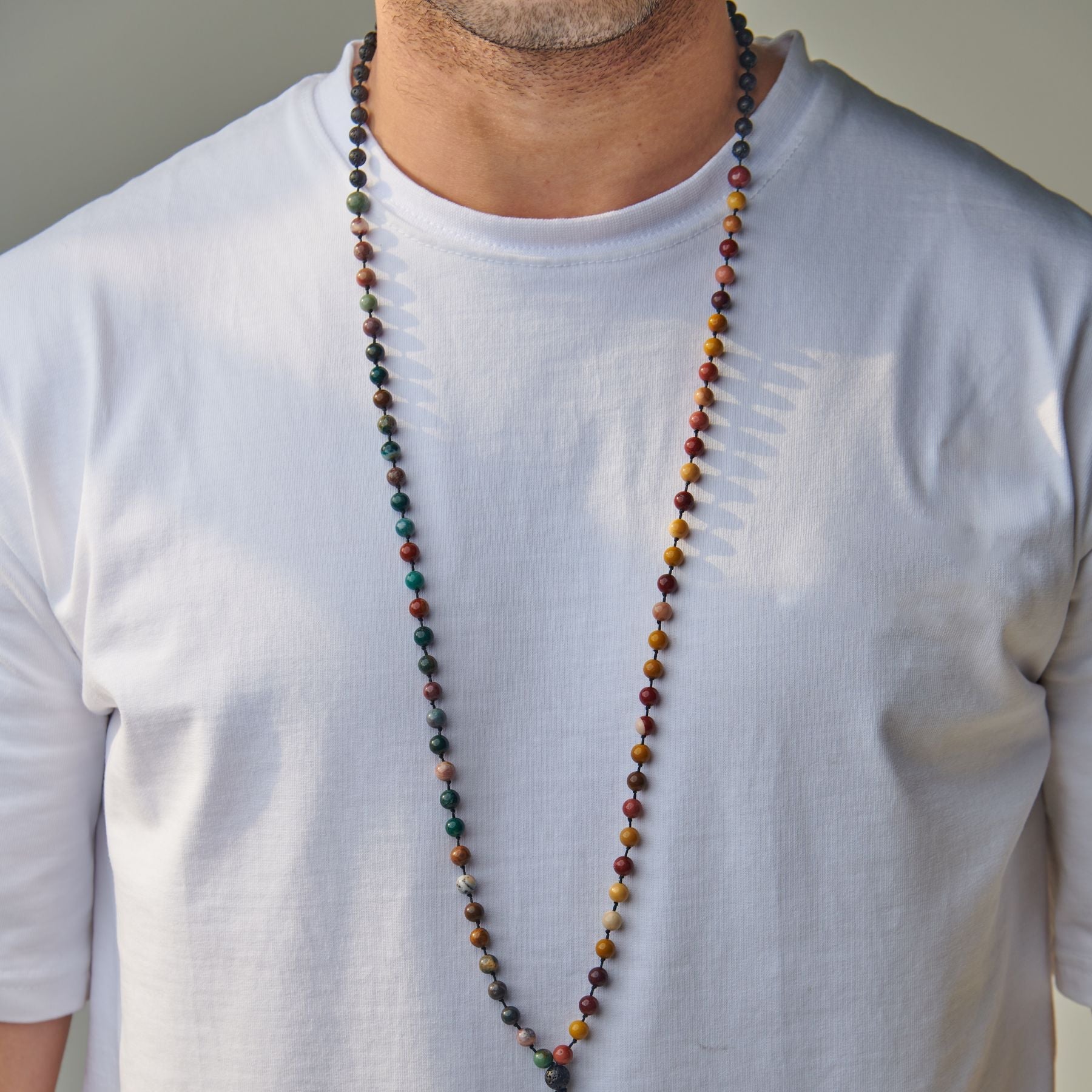 We offer you this wonderful rosary bracelet that you can wear all the time, accompany you in your day, inspire you and remind you of what is important, and add a beautiful touch to your daily look.This piece of art is carved from natural Moccaite, Mosaic Agate and Lava stones, carefully arranged, and assembled with a very strong thread that we guarantee for life.Our artists designed this rosary bracelet to be easily worn, just pull the small hand-braided lighthouse to untie (loose) the rosary, then wrap it three times around your wrist, and tighten it to become wrapped comfortably and conveniently.