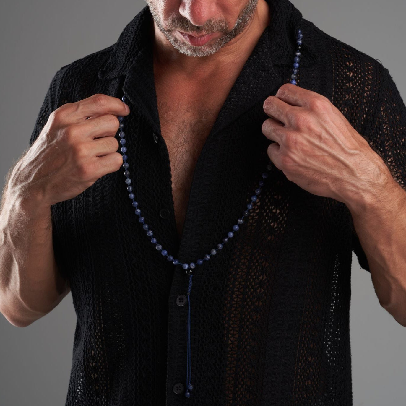 We offer you this wonderful rosary bracelet that you can wear all the time, accompany you in your day, inspire you and remind you of what is important, and add a beautiful toThis piece of art is carved from natural sodalite stone, carefully arranged, and assembled with a very strong thread that we guarantee for life.Our artists designed this rosary bracelet to be easily worn, just pull the small hand-braided lighthouse to untie (loose) the rosary, then wrap it three times around your wrist, and tighten it to become wrapped comfortably and conveniently.