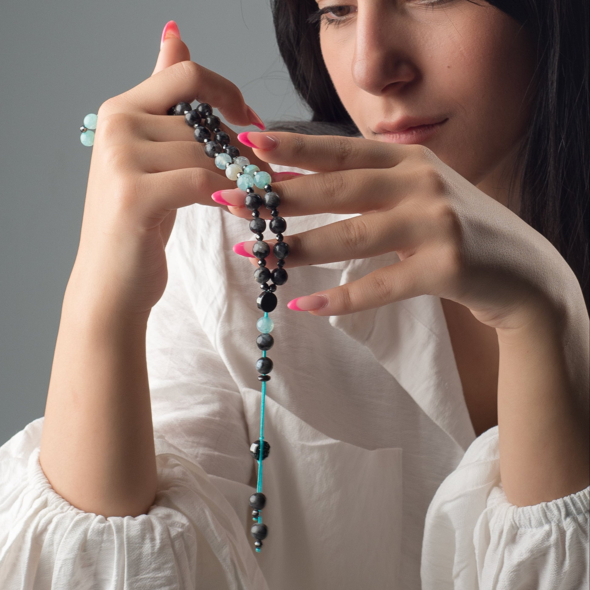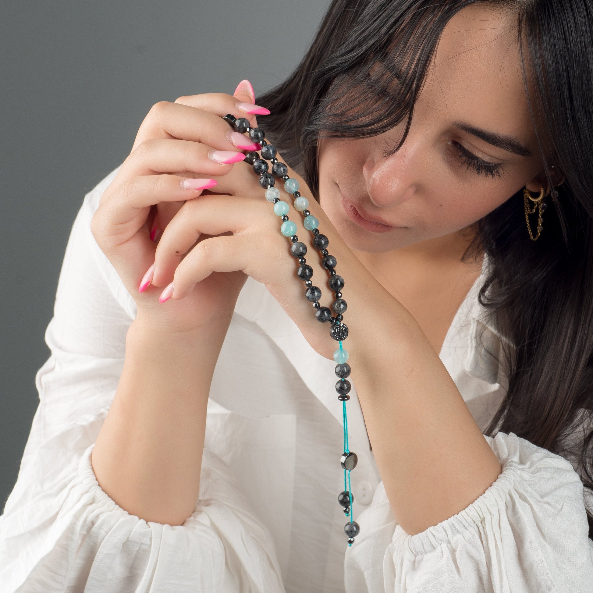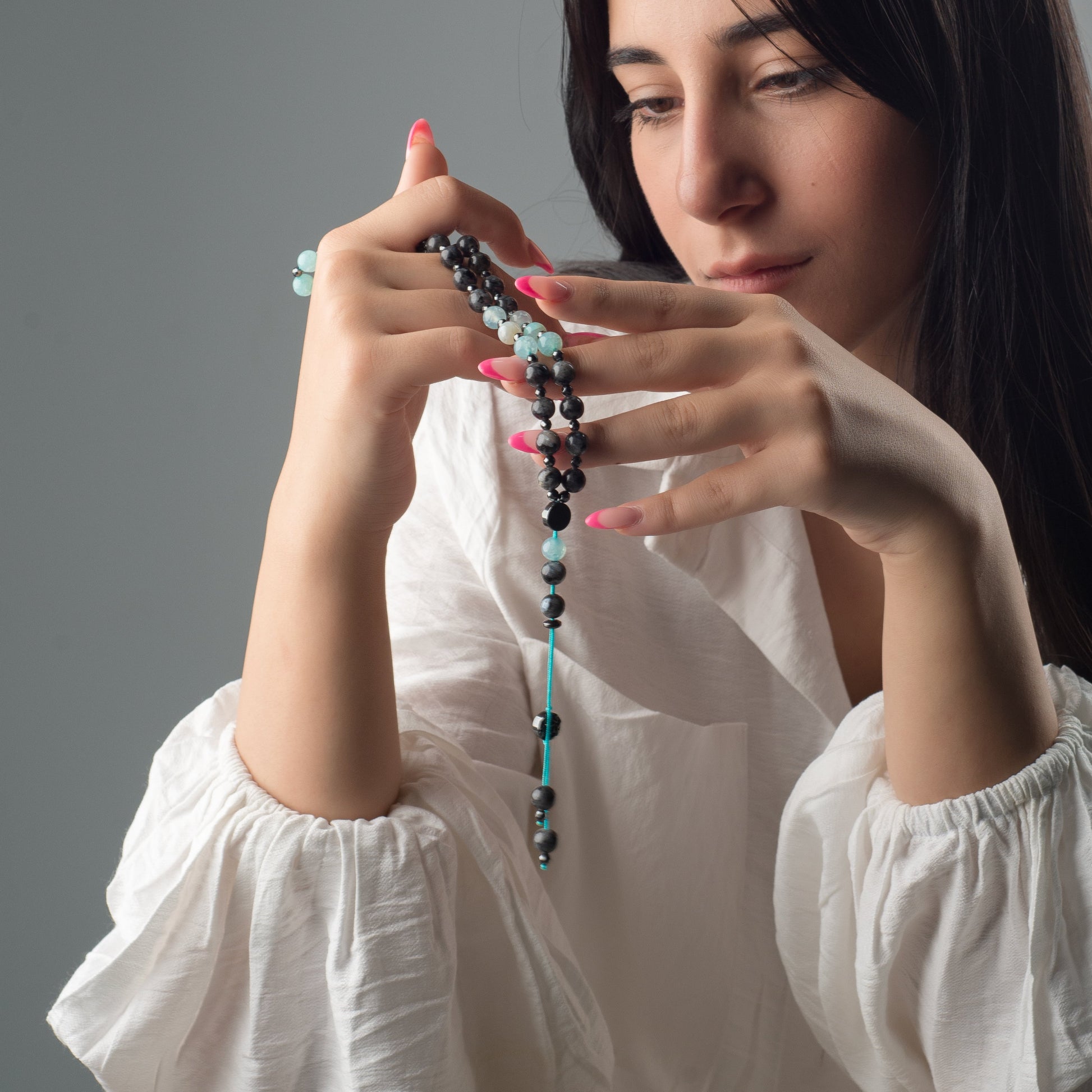 We offer you this wonderful rosary bracelet that you can wear all the time, accompany you in your day, inspire you and remind you of what is important, and add an aesthetic touch to your daily look.This piece of art is carved from natural Labradorite stone and Agate stone , carefully arranged, and assembled with a very strong thread that we guarantee for life.Our artists designed this rosary bracelet to be easily worn, just pull the small hand-braided lighthouse to untie (loose) the rosary, then wrap it 2 times around your wrist, and tighten it to become wrapped comfortably and conveniently.