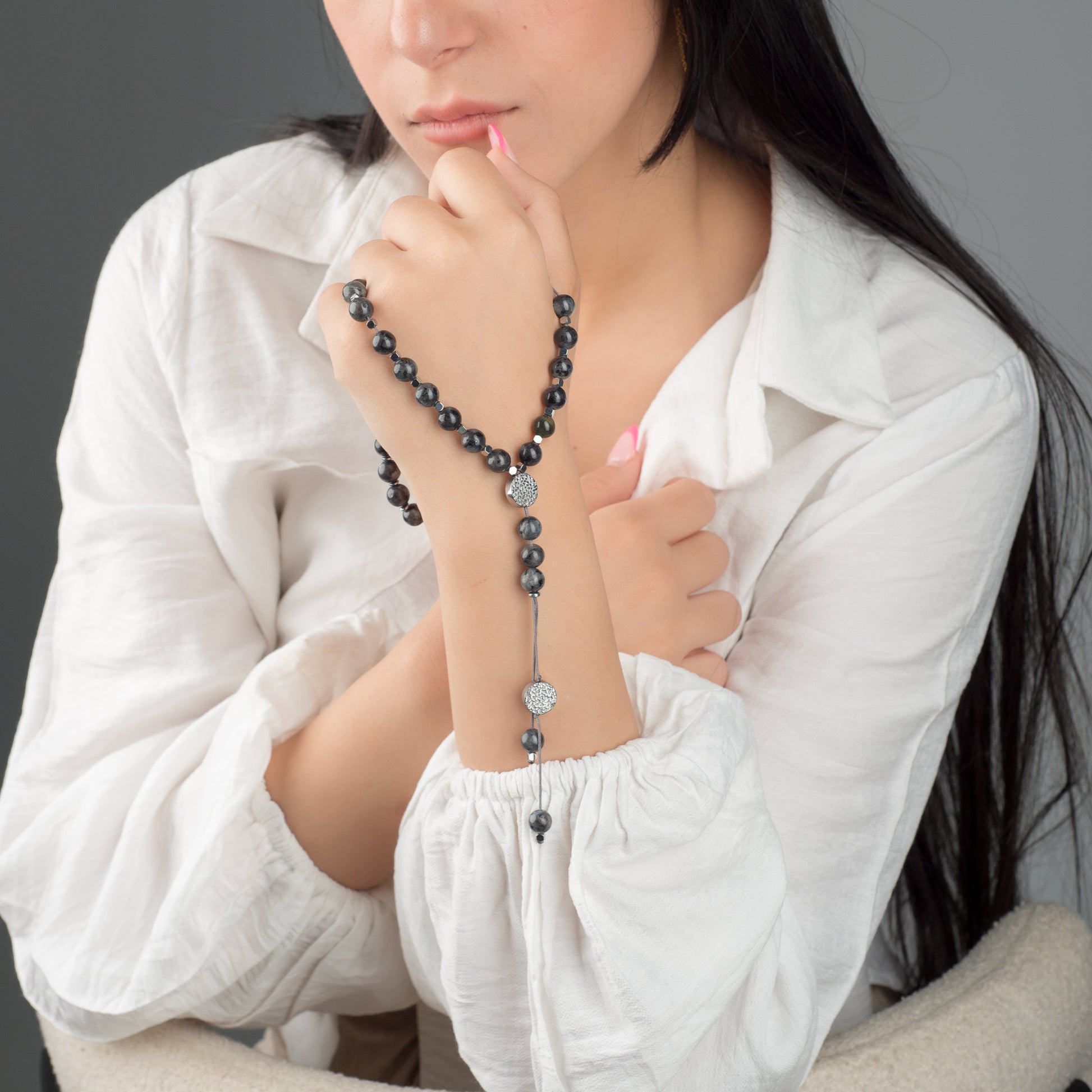 We offer you this wonderful rosary bracelet that you can wear all the time, accompany you in your day, inspire you and remind you of what is important, and add an aesthetic touch to your daily look.This piece of art is carved from natural Labradorite stone and Tiger Eye stone , carefully arranged, and assembled with a very strong thread that we guarantee for life.Our artists designed this rosary bracelet to be easily worn, just pull the small hand-braided lighthouse to untie (loose) the rosary, then wrap it 2 times around your wrist, and tighten it to become wrapped comfortably and conveniently.