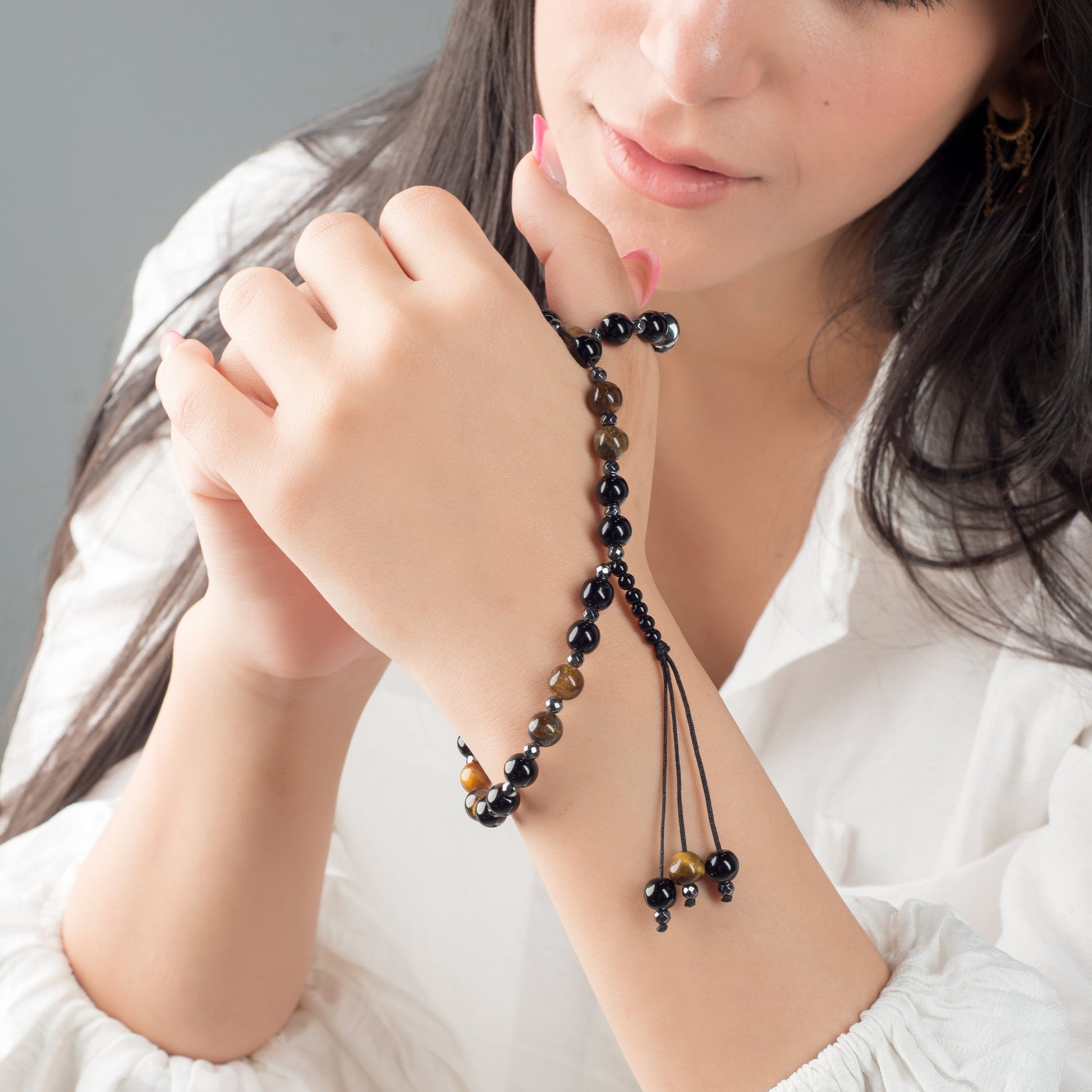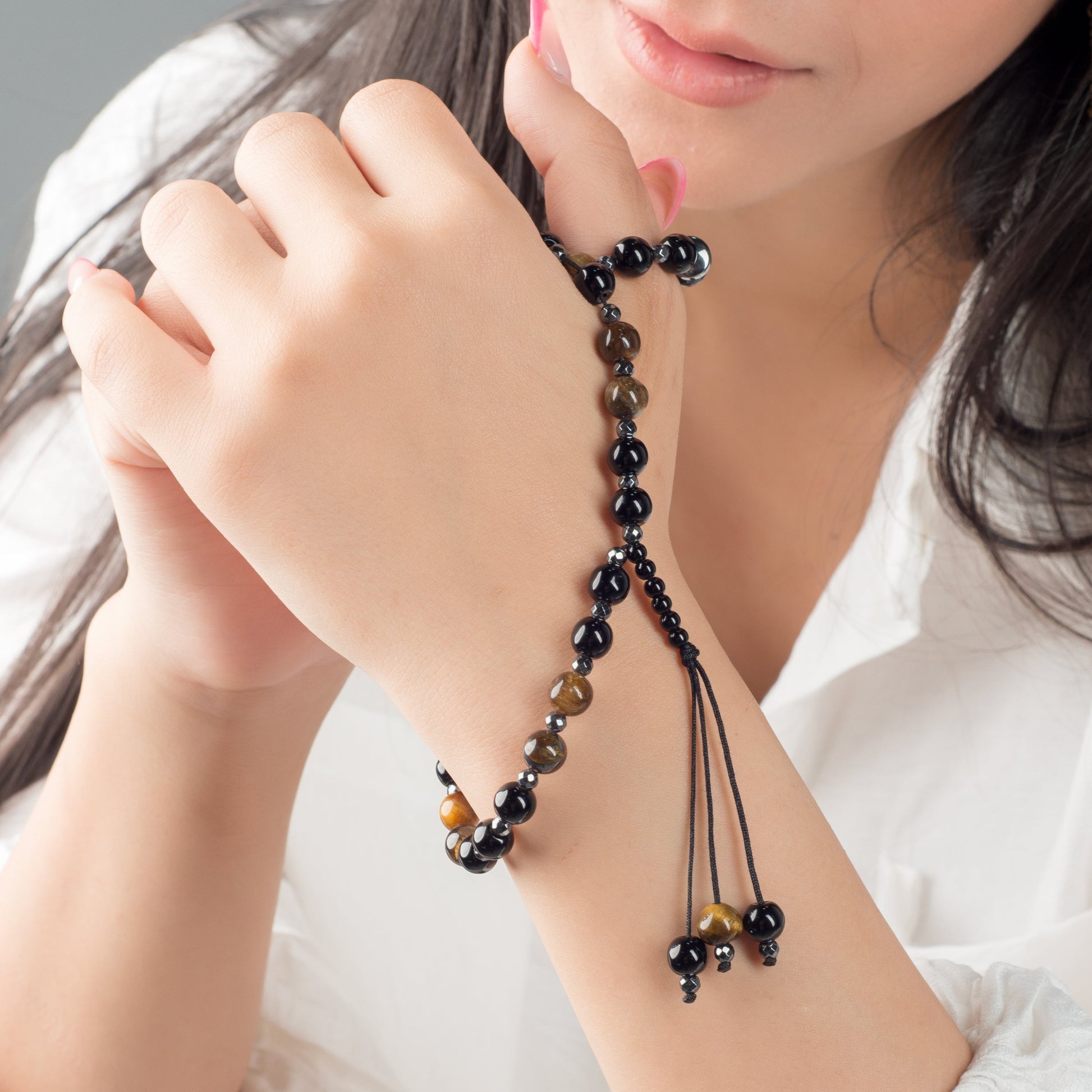 We offer you this wonderful rosary bracelet that you can wear all the time, accompany you in your day, inspire you and remind you of what is important, and add an aesthetic touch to your daily look.This piece of art is carved from natural Tiger Eye stone and Onyx stone , carefully arranged, and assembled with a very strong thread that we guarantee for life.Our artists designed this rosary bracelet to be easily worn, just pull the small hand-braided lighthouse to untie (loose) the rosary, then wrap it 2 times around your wrist, and tighten it to become wrapped comfortably and conveniently.