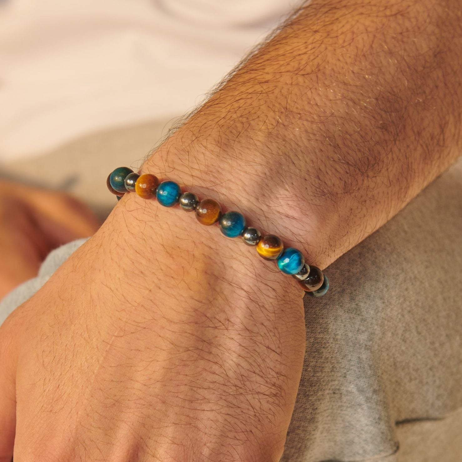 This bracelet features an elegant circular shape, adding a charming touch. Handcrafted with love, it's crafted from tiger's eye and studded with hematite, making it a precious gift.